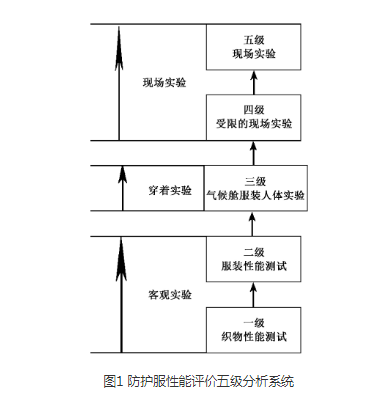 防化服的性能評(píng)價(jià)主要包含防護(hù)性能以及舒適性2個(gè)方面。目前成熟的評(píng)價(jià)體系是五級(jí)分析系統(tǒng),如圖1所示??梢詣澐譃榭陀^評(píng)價(jià)、人體穿著實(shí)驗(yàn)以及現(xiàn)場(chǎng)實(shí)驗(yàn)3個(gè)層次。