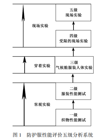 防化服的性能評價主要包含防護性能以及舒適性2個方面。 目前成熟的評價體系是五級分析系統(tǒng),如圖1所示。可以劃分為客觀評價、人體穿著實驗以及現(xiàn)場實驗3個層次。
