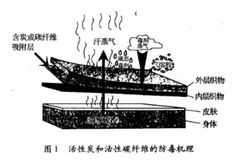活性炭和活性碳纖維在防化服中應用,主要是依靠防油一吸附或鋪展一防液滲透一吸附的防毒機理(如圖1所示),使防化服在防毒的同時準許人體產生的汗液蒸氣和熱量向外散發(fā),既滿足防護性能要求又滿足穿著舒適性的要求。