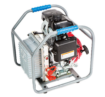 符合國家標準GB/T17906-1999《液壓破拆工具通用技術條件》,機動泵的總質(zhì)量23.6kg,機動泵對工具進行密封性能試驗,工具閉合或全開狀態(tài),在63MPa條件下,應無液壓油泄漏。機動泵額定工作壓力63MPa,高壓流量0.4L/min,低壓工作壓力10 MPa,低壓流量1.3 L/min。